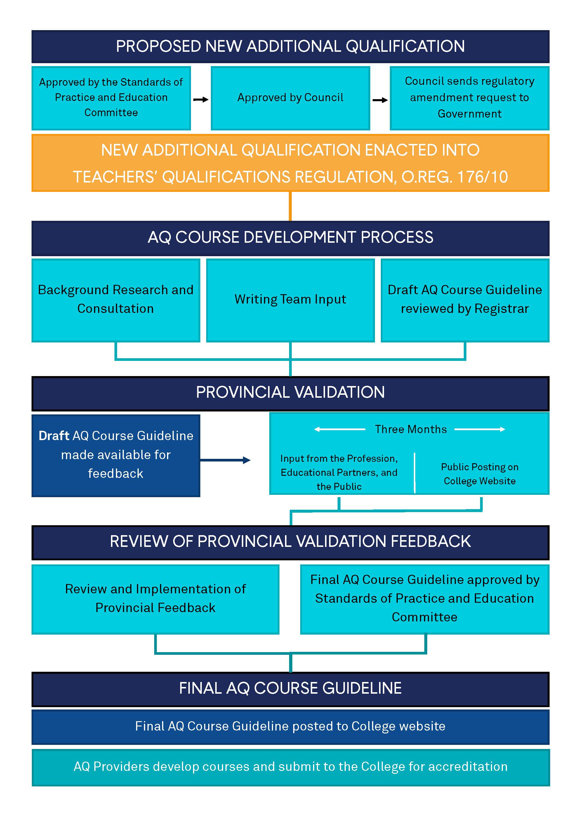 An infographic of a process chart describing the Additional Qualification (AQ) Development Process. The process chart has five tiers describing each stage in the process.